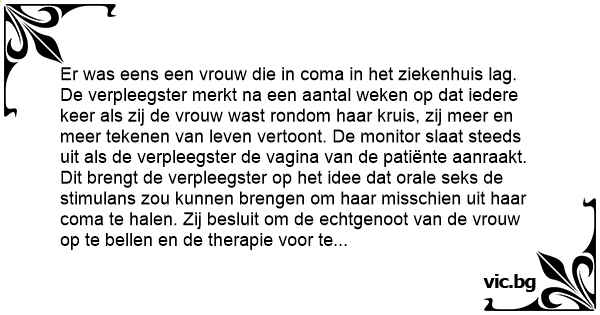 Er was eens een vrouw die in coma in het ziekenhuis lag. De verpleegster merkt na een aantal weken op dat iedere keer als zij de vrouw wast rondom haar kruis, zij meer en meer tekenen van leven vertoont. De monitor slaat steeds uit als de verpleegster de vаginа van de patiënte aanraakt. Dit brengt de verpleegster op het idee dat orale sекs de stimulans zou kunnen brengen om haar misschien uit haar coma te halen. Zij besluit om de echtgenoot van de vrouw op te bellen en de therapie voor te stellen. De man besluit in te stemmen met het voorstel.