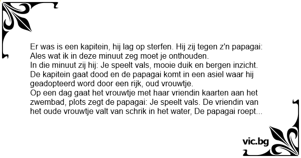 Er was is een kapitein, hij lag op sterfen. Hij zij tegen z'n papagai: Ales wat ik in deze minuut zeg moet je onthouden.