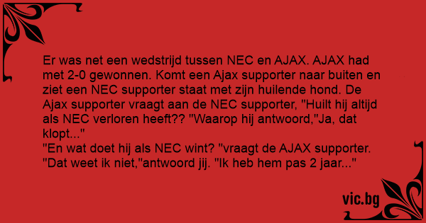 Er was net een wedstrijd tussen NEC en AJAX. AJAX had met 2-0 gewonnen. Komt een Ajax supporter naar buiten en ziet een NEC supporter staat met zijn huilende hond. De Ajax supporter vraagt aan de NEC supporter, "Huilt hij altijd als NEC verloren heeft?? "Waarop hij antwoord,"Ja, dat klopt..."