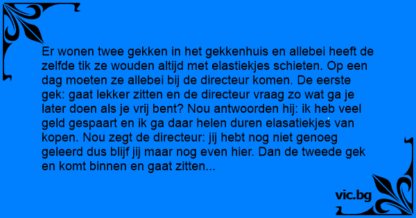 Er wonen twee gekken in het gekkenhuis en allebei heeft de zelfde tik ze wouden altijd met elastiekjes schieten. Op een dag moeten ze allebei bij de directeur komen. De eerste gek: gaat lekker zitten en de directeur vraag zo wat ga je later doen als je vrij веnт? Nou antwoorden hij: ik heb veel geld gespaart en ik ga daar helen duren elasatiekjes van kopen. Nou zegt de directeur: jij hebt nog niet genoeg geleerd dus blijf jij maar nog even hier. Dan de tweede gek en komt binnen en gaat zitten en de directeur vraagt ook aan hem wat ga jij doen als jij hier weg веnт? Nou zegt de tweede gek ik ga eerst lekker mokkel zoeken en die neem ik mee naar huis. De Directeur dol enthousiast en denkt die heeft veel geleerd hier. Daarna zegt de gek: dan kleed ik haar uit en neem haar lekker mee naar bed. De directeur kon het maar niet geloven en keek hem lachend aan. Toen zij de gek: daarna pak ik haar onderbroek haal het elastiekje eruit en ga er lekker mee schieten!