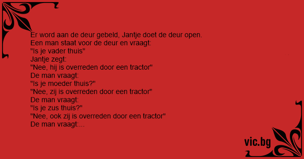 Er staat een verkoper bij Jantje aan de deur en vraagt “Is je moeder misschien thuis?” “Nee,” zegt Jantje “die is onder de trekker gekomen.” “Oh, sorry wat vreselijk” zegt de verkoper “is...