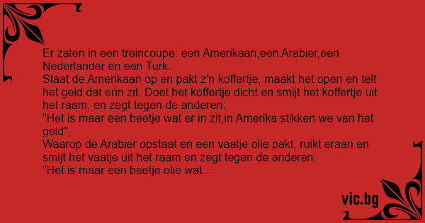 Er zaten in een treincoupe: een Amerikaan,een Arabier,een Nederlander en een Turk.