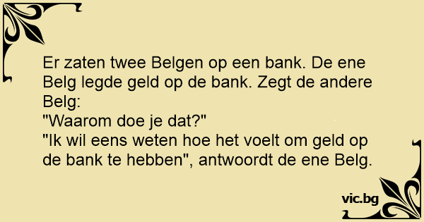 Er zaten twee Belgen op een bank. De ene Belg legde geld op de bank. Zegt de andere Belg: