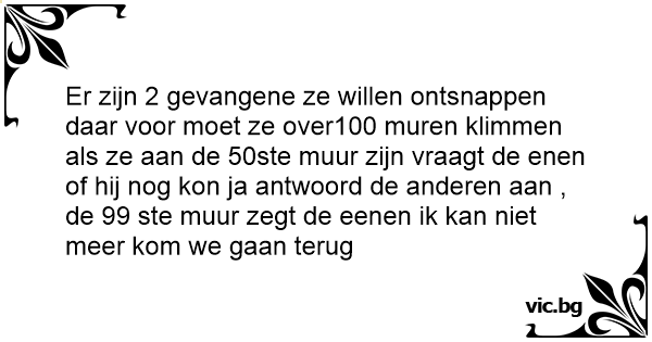 Er zijn 2 gevangene ze willen ontsnappen daar voor moet ze over100 muren klimmen als ze aan de 50ste muur zijn vraagt de enen of hij nog kon ja antwoord de anderen aan , de 99 ste muur zegt de eenen ik kan niet meer kom we gaan terug