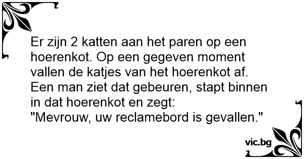 Er zijn 2 katten aan het paren op een hoerenkot. Op een gegeven moment vallen de katjes van het hoerenkot af. Een man ziet dat gebeuren, stapt binnen in dat hoerenkot en zegt: