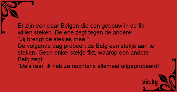 Er zijn een paar Belgen die een gebouw in de fik willen steken. De ene zegt tegen de andere:
