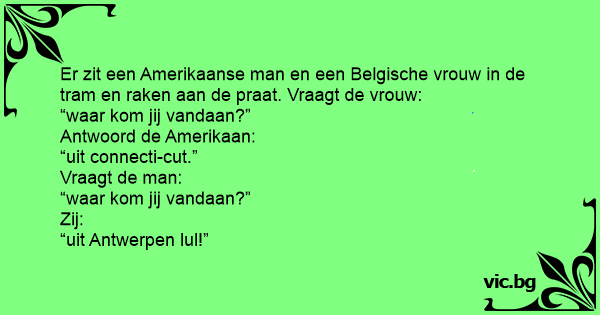 Er zit een Amerikaanse man en een Belgische vrouw in de tram en raken aan de praat. Vraagt de vrouw: