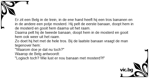 Er zit een Belg in de trein, in de ene hand heeft hij een tros bananen en in de andere een potje mosterd. Hij pelt de eerste banaan, doopt hem in de mosterd en gooit hem daarna uit het raam.