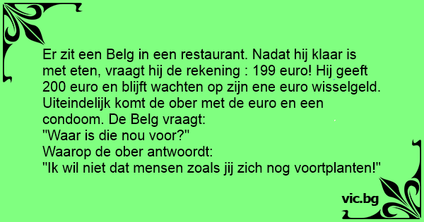 Er zit een Belg in een restaurant. Nadat hij klaar is met eten, vraagt hij de rekening : 199 euro! Hij geeft 200 euro en blijft wachten op zijn ene euro wisselgeld. Uiteindelijk komt de ober met de euro en een condoom. De Belg vraagt:
