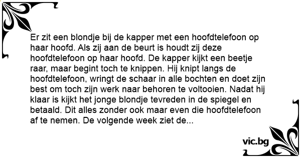 Er zit een blondje bij de kapper met een hoofdtelefoon op haar hoofd. Als zij aan de beurt is houdt zij deze hoofdtelefoon op haar hoofd. De kapper kijkt een beetje raar, maar begint toch te knippen. Hij knipt langs de hoofdtelefoon, wringt de schaar in alle bochten en doet zijn best om toch zijn werk naar behoren te voltooien. Nadat hij klaar is kijkt het jonge blondje tevreden in de spiegel en betaald. Dit alles zonder ook maar even die hoofdtelefoon af te nemen. De volgende week ziet de kapper tot zijn grote verbazing het jonge blondje weer in zijn zaak verschijnen en weer heeft ze die hoofdtelefoon op en een walk-man in haar hand. Als het haar beurt is houdt zij ook weer die verdomde hoofdtelefoon op haar hoofd. De kapper wringt de schaarweer in alle bochten en maakt haar nog meer tevreden dan de vorige keer. De kapper neemt zich voor de hoofdtelefoon af te nemen als zij zich nogmaals in zijn zaak vertoont. De volgende week is het dan zover. Het jonge blondje neemt plaats in de kappersstoel en wacht tot de kapper begint. Deze heeft er schoon genoeg van, neemt de hoofdtelefoon af en begint te knippen. Als hij zowat vijf minuten aan het knippen is, valt het blondje uit zijn stoel op de grond. De dokter wordt er bijgeroepen en stelt vast dat het blondje overleden is. De kapper, verwonderd van het voorval legt meteen het verband met haar walk-man. Hij zet de hoofdtelefoon op en luistert: