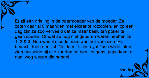 Er zit een drieling in de baarmoeder van de moeder. Ze zaten daar al 6 maanden met elkaar te rotzooien, en op een dag zijn ze zoo verveeld dat ze maar besluiten poker te gaan spelen. Omdat ze nog niet geboren waren heetten ze 1, 2,& 3. Nou was 3 steeds maar aan het verliezen. Hij bedacht toen een list. Net toen 1 zijn royal flush wilde laten zien husselde hij alle kaarten en riep, jongens, papa komt er aan, weg wezen die handel.