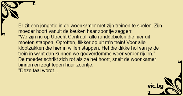 Er zit een jongetje in de woonkamer met zijn treinen te spelen. Zijn moeder hoort vanuit de keuken haar zoontje zeggen: