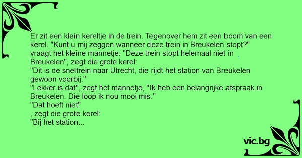"Zou u dat willen doen?" vraagt het mannetje. "Tuurlijk", zegt de kerel. Zo gezegd zo gedaan. De kerel houdt het mannetje uit het raam bij Breukelen, het mannetje loopt hard over het perron mee en wordt losgelaten. Als de grote kerel in Utrecht uitstapt, ziet hij daar ineens het kleine mannetje weer lopen. "Hè", zegt hij, "Ik had je in Breukelen toch uit de trein gelaten? Wat doe jij nou hier?"