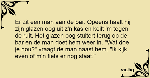 Er zit een man aan de bar. Opeens haalt hij zijn glazen oog uit z'n kas en keilt 'm tegen de ruit. Het glazen oog stuitert terug op de bar en de man doet hem weer in. "Wat doe je nou?" vraagt de man naast hem. "Ik kijk even of m'n fiets er nog staat."