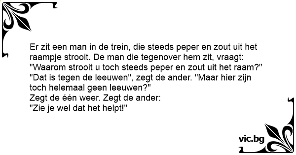 Er zit een man in de trein, die steeds peper en zout uit het raampje strooit. De man die tegenover hem zit, vraagt: