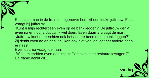 Er zit een man in de trein en tegenover hem zit een leuke juffrouw. Plots vraagt hij juffrouw: