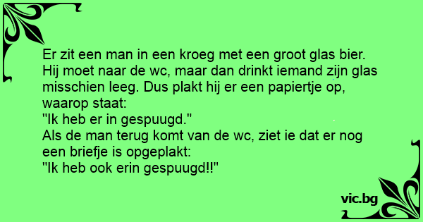 Er zit een man in een kroeg met een groot glas bier. Hij moet naar de wc, maar dan drinkt iemand zijn glas misschien leeg. Dus plakt hij er een papiertje op, waarop staat: