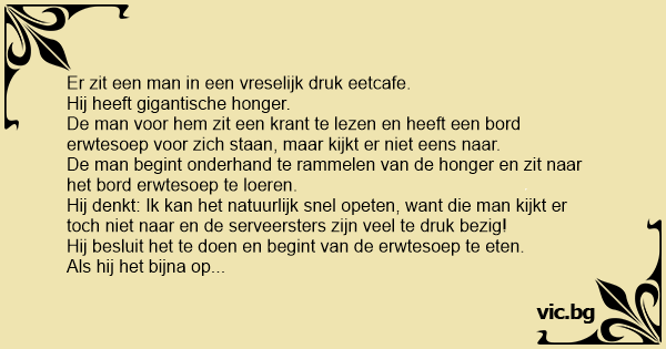 De man voor hem zit een krant te lezen en heeft een bord erwtesoep voor zich staan, maar kijkt er niet eens naar.