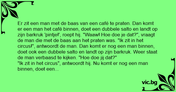 Er zit een man met de baas van een café te praten. Dan komt er een man het café binnen, doet een dubbele salto en landt op zijn barkruk 'pintje!', roept hij. "Waaw! Ное doe je dat?", vraagt de man die met de baas aan het praten was. "Ik zit in het circus!", antwoordt de man. Dan komt er nog een man binnen, doet ook een dubbele salto en landt op zijn barkruk. Weer staat de man verbaasd te kijken. "Ное doe jij dat?"