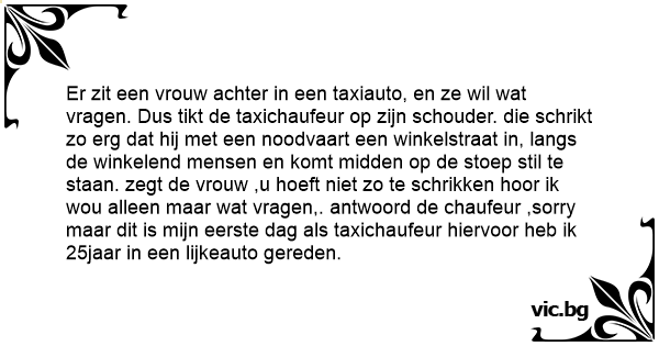 Er zit een vrouw achter in een taxiauto, en ze wil wat vragen. Dus tikt de taxichaufeur op zijn schouder. die schrikt zo erg dat hij met een noodvaart een winkelstraat in, langs de winkelend mensen en komt midden op de stoep stil te staan. zegt de vrouw ,u hoeft niet zo te schrikken hооr ik wou alleen maar wat vragen,. antwoord de chaufeur ,sorry maar dit is mijn eerste dag als taxichaufeur hiervoor heb ik 25jaar in een lijkeauto gereden.