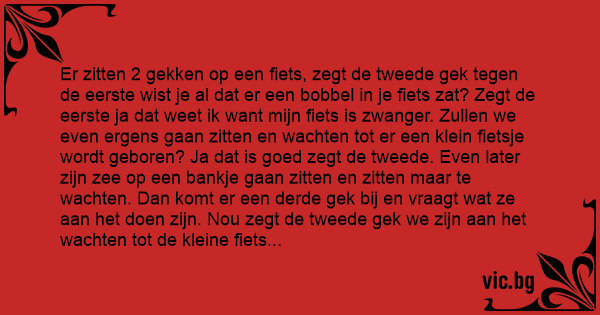 Er zitten 2 gekken op een fiets, zegt de tweede gek tegen de eerste wist je al dat er een bobbel in je fiets zat? Zegt de eerste ja dat weet ik want mijn fiets is zwanger. Zullen we even ergens gaan zitten en wachten tot er een klein fietsje wordt geboren? Ja dat is goed zegt de tweede. Even later zijn zee op een bankje gaan zitten en zitten maar te wachten. Dan komt er een derde gek bij en vraagt wat ze aan het doen zijn. Nou zegt de tweede gek we zijn aan het wachten tot de kleine fiets geboren wordt. Dan begint de derde gek erg hard te lachen en zegt dat kan toch helemaal niet dit is een herenfiets!