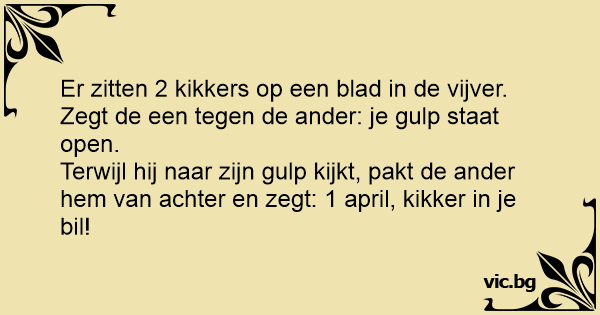 Terwijl hij naar zijn gulp kijkt, pakt de ander hem van achter en zegt: 1 april, kikker in je bil!