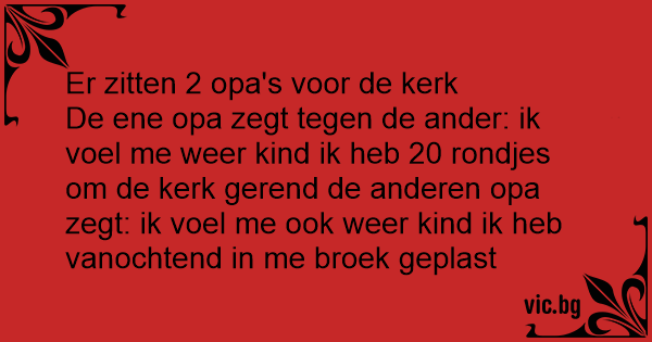De ene opa zegt tegen de ander: ik voel me weer kind ik heb 20 rondjes om de kerk gerend de anderen opa zegt: ik voel me ook weer kind ik heb vanochtend in me broek geplast