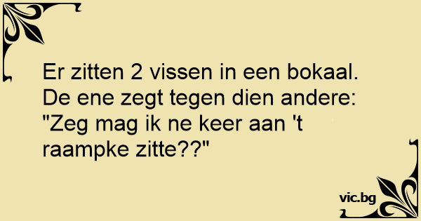 Er zitten 2 vissen in een bokaal. De ene zegt tegen dien andere:<br />"Zeg mag ik ne keer aan 't raampke zitte??"