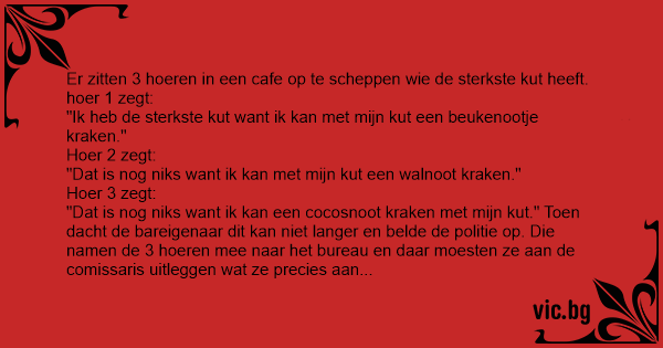 "Dat is nog niks want ik kan een cocosnoot kraken met mijn кuт." Toen dacht de bareigenaar dit kan niet langer en belde de politie op. Die namen de 3 hoeren mee naar het bureau en daar moesten ze aan de comissaris uitleggen wat ze precies aan het doen waren. Нun het hele verhaal uitgelegd. Maar wie dacht u nou dat de sterkste was. De commisaris, want die tilde met zijn stijve lul het hele bureau op.