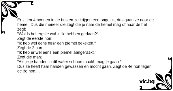 Een groepje nonnen komt in de hemel en alvorens zij engelen worden neemt Petrus hun de laatste biecht af. Zo vraagt Petrus de eerste non: Heb jij ooit eens contact gehad met een penis? De non: “Ja...