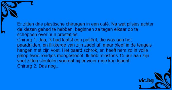 Chirurg 2: Das nog niets! Ik had laatst een dronkelap, die in zijn roes niet over het hek van zijn eigen tuin klom, maar over het hek van zijn buurman, die in het gezelschap woont van twee Doberman honden. En toen hij er ééntje aanzag voor zijn vrouw, heeft hij zijn lul eraf gebeten. Ik heb drie dagen non-stop staan zwoegen om die man weer te kunnen laten plassen.