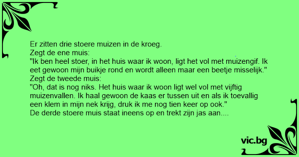 De derde stoere muis staat ineens op en trekt zijn jas aan. Nou denken die andere twee, wij zijn toch wel het stoerst hé, want hij druipt af.