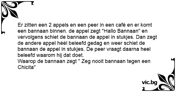 Er zitten een 2 appels en een peer in een café en er komt een bannaan binnen. de appel zegt "Hallo Bannaan" en vervolgens schiet de bannaan de appel in stukjes. Dan zegt de andere appel héél beleefd gedag en weer schiet de bannaan de appel in stukjes. De peer vraagt daarna heel beleefd waarom hij dat doet.