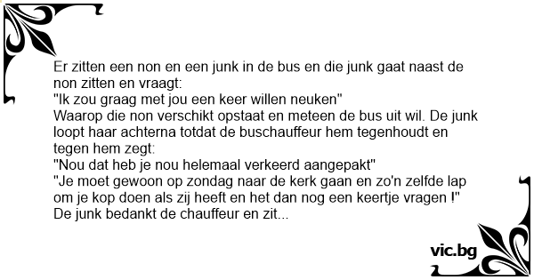 "Je moet gewoon op zondag naar de kerk gaan en zo'n zelfde lap om je кор doen als zij heeft en het dan nog een keertje vragen !" De junk bedankt de chauffeur en zit inderdaad op zondag in de kerk met een nonnen hoofddoek om zijn кор.