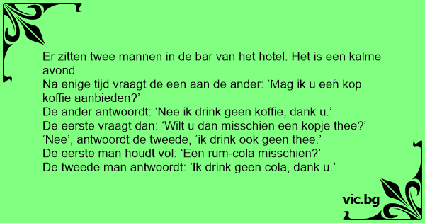 De tweede man antwoordt: ‘Ik drink geen cola, dank u.’