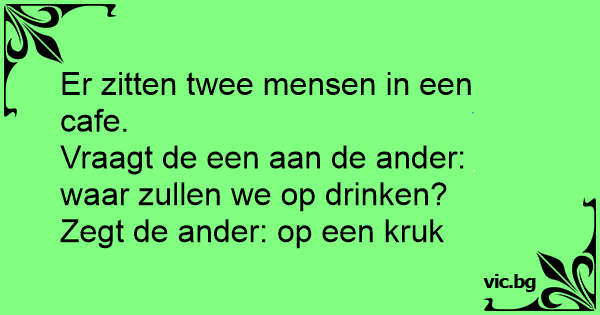 Er zitten twee mensen in een cafe. Vraagt de een aan de ander: waar zullen we op drinken? Zegt de ander: op een kruk