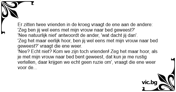 'Zeg het maar eerlijk hооr, ben jij wel eens met mijn vrouw naar bed geweest?' vraagt die ene weer.