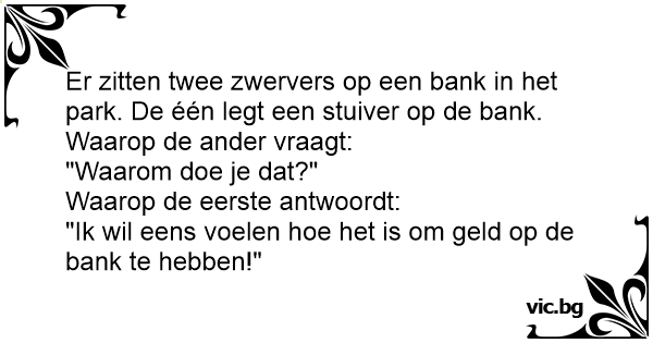 Er zitten twee zwervers op een bank in het park. De één legt een stuiver op de bank. Waarop de ander vraagt: