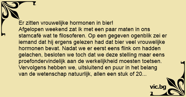 Afgelopen weekend zat ik met een paar maten in ons stamcafé wat te filosoferen. Op een gegeven ogenblik zei er iemand dat hij ergens gelezen had dat bier veel vrouwelijke hormonen bevat. Nadat we er eerst eens flink om hadden gelachen, besloten we toch dat we deze stelling maar eens proefondervindelijk aan de werkelijkheid moesten toetsen. Vervolgens hebben we, uitsluitend en puur in het belang van de wetenschap natuurlijk, allen een stuk of 20 jupilers gedronken. Aan het eind van het experiment hadden we effectief bewezen dat bier vol vrouwelijke hormonen zit: