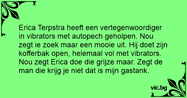Erica Terpstra heeft een vertegenwoordiger in vibrators met autopech geholpen. Nou zegt ie zoek maar een mooie uit. Hij doet zijn kofferbak open, helemaal vol met vibrators. Nou zegt Erica doe die grijze maar. Zegt de man die krijg je niet dat is mijn gastank.