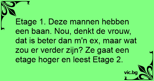 Etage 1. Deze mannen hebben een baan. Nou, denkt de vrouw, dat is beter dan m'n ex, maar wat zou er verder zijn? Ze gaat een etage hoger en leest Etage 2.