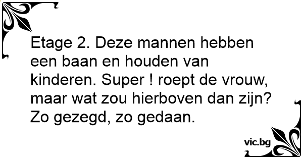 Etage 2. Deze mannen hebben een baan en houden van kinderen. Super ! roept de vrouw, maar wat zou hierboven dan zijn? Zo gezegd, zo gedaan.