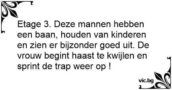 Etage 3. Deze mannen hebben een baan, houden van kinderen en zien er bijzonder goed uit. De vrouw begint haast te kwijlen en sprint de trap weer op !