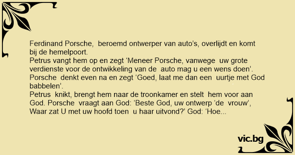 Vynálezce vozu Porsche umře a dostane se do nebe. Svatý Petr ho přijímá a povídá: „Za tvé zásluhy pro motoristiku je ti dáno jedno přání. Co by sis přál?” Ferdinand Porsche chvíli uvažuje a říká:...