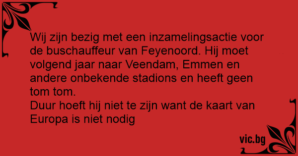 Wij zijn bezig met een inzamelingsactie voor de buschauffeur van Feyenoord. Hij moet volgend jaar naar Veendam, Emmen en andere onbekende stadions en heeft geen tom tom.