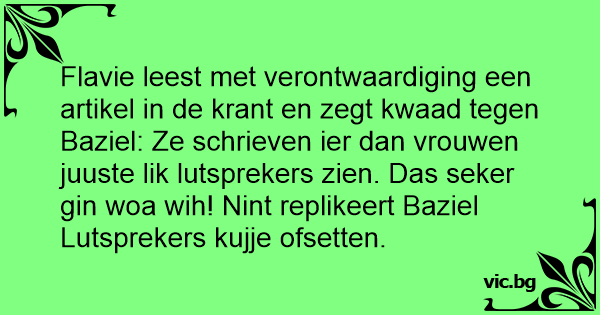 Flavie leest met verontwaardiging een artikel in de krant en zegt kwaad tegen Baziel: Ze schrieven ier dan vrouwen juuste lik lutsprekers zien. Das seker gin woa wih! Nint replikeert Baziel Lutsprekers kujje ofsetten.
