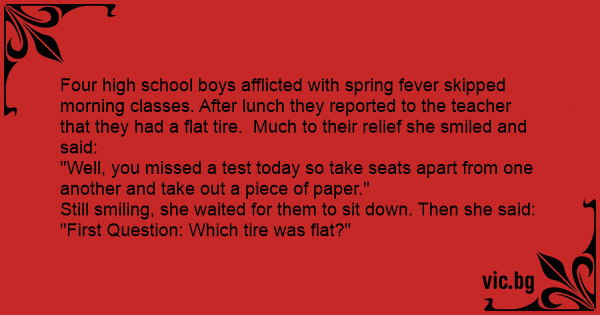 Four high school boys afflicted with spring fever skipped morning classes. After lunch they reported to the teacher that they had a flat tire. Much to their relief she smiled and said: