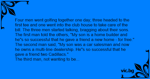 Four men went golfing together one day; three headed to the first tee and one went into the club house to take care of the bill. The three men started talking, bragging about their sons. The first man told the others, "My son is a home builder and he"s so successful that he gave a friend a new home - for free."