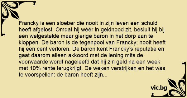 Francky is een sloeber die nooit in zijn leven een schuld heeft afgelost. Omdat hij wéér in geldnood zit, besluit hij bij een welgestelde maar gierige baron in het dorp aan te kloppen. De baron is de tegenpool van Francky; nooit heeft hij één cent verloren. De baron kent Francky’s reputatie en gaat daarom alleen akkoord met de lening mits de voorwaarde wordt nageleefd dat hij z’n geld na een week met 10% rente terugkrijgt. De weken verstrijken en het was te voorspellen: de baron heeft zijn geld nog steeds niet terug. Telkens weer weet Francky aan hem te ontkomen. Tot Francky op een dag het dorpscafé binnenloopt waar de baron zit.