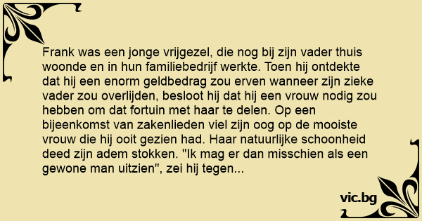Frank was een jonge vrijgezel, die nog bij zijn vader thuis woonde en in hun familiebedrijf werkte. Toen hij ontdekte dat hij een enorm geldbedrag zou erven wanneer zijn zieke vader zou overlijden, besloot hij dat hij een vrouw nodig zou hebben om dat fortuin met haar te delen. Op een bijeenkomst van zakenlieden viel zijn oog op de mooiste vrouw die hij ooit gezien had. Haar natuurlijke schoonheid deed zijn adem stokken. "Ik mag er dan misschien als een gewone man uitzien", zei hij tegen haar, "maar binnen niet al te lange tijd zal mijn vader sterven, en dan zal ik 20 miljoen euro erven." Geïnteresseerd nam de vrouw zijn visitekaartje in ontvangst en drie dagen later werd ze zijn stiefmoeder. Vrouwen zijn zo veel beter in financiëel plannen dan mannen.